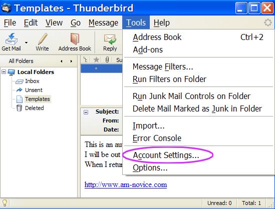Below you will find instructions for the newbie or the novice on how to set up an automatic "Out of Office" email auto reply or a "On Vacation" auto response if you use Mozilla Thunderbird as your email client in a POP3 account. For more information about the Mozilla Thunderbird client, please refer to this site.